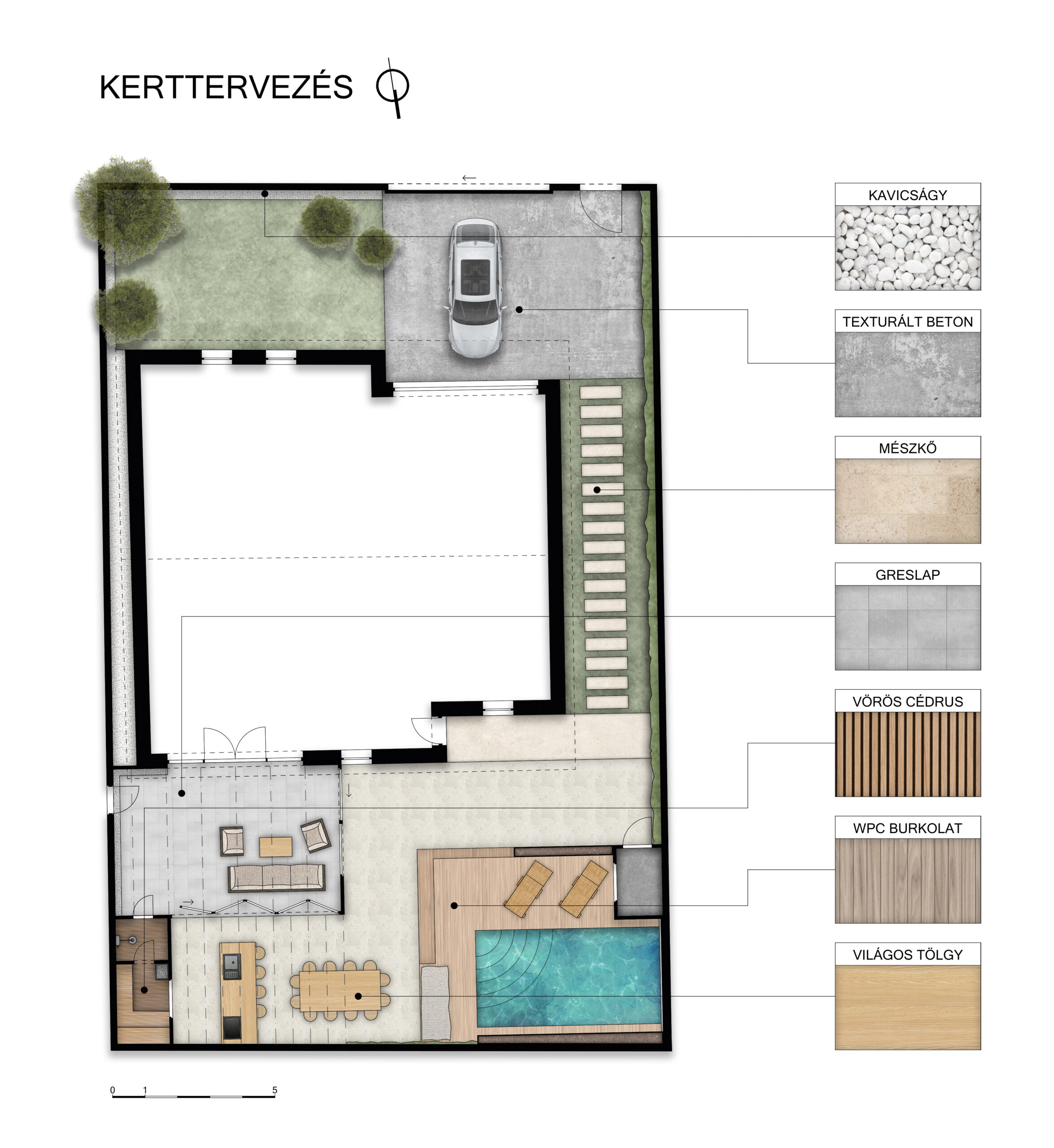 Megrendelőnk a meglévő lakóépületének a hátsó kertjét szerette volna élettel megtölteni, amelynek a vázlat- és látványterveit örömmel készítettük el. A meglévő lakóépület belső elrendezéséhez igazodva, ezzel szimmetrikusan alakítottuk ki a hátsó kertet.