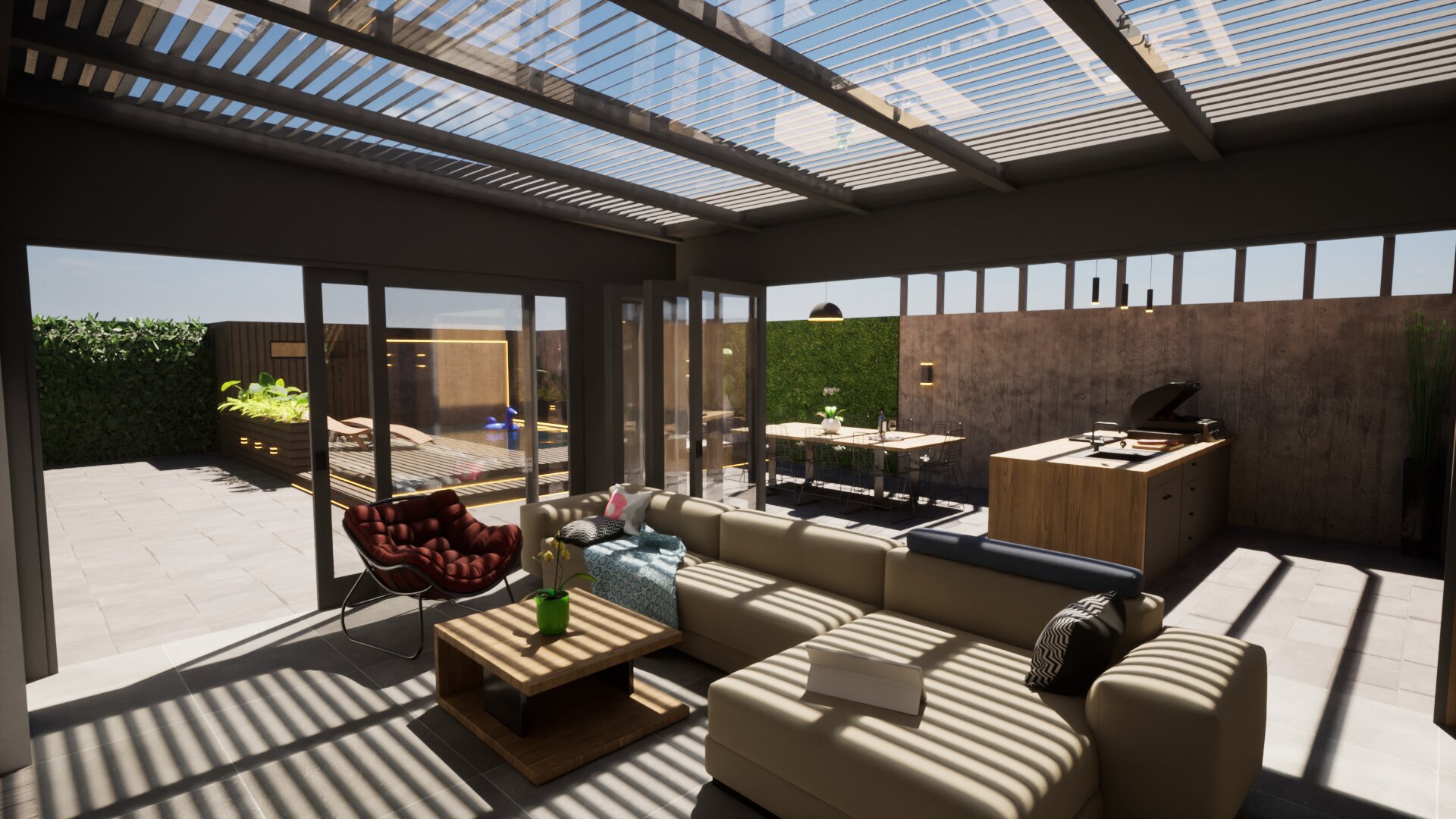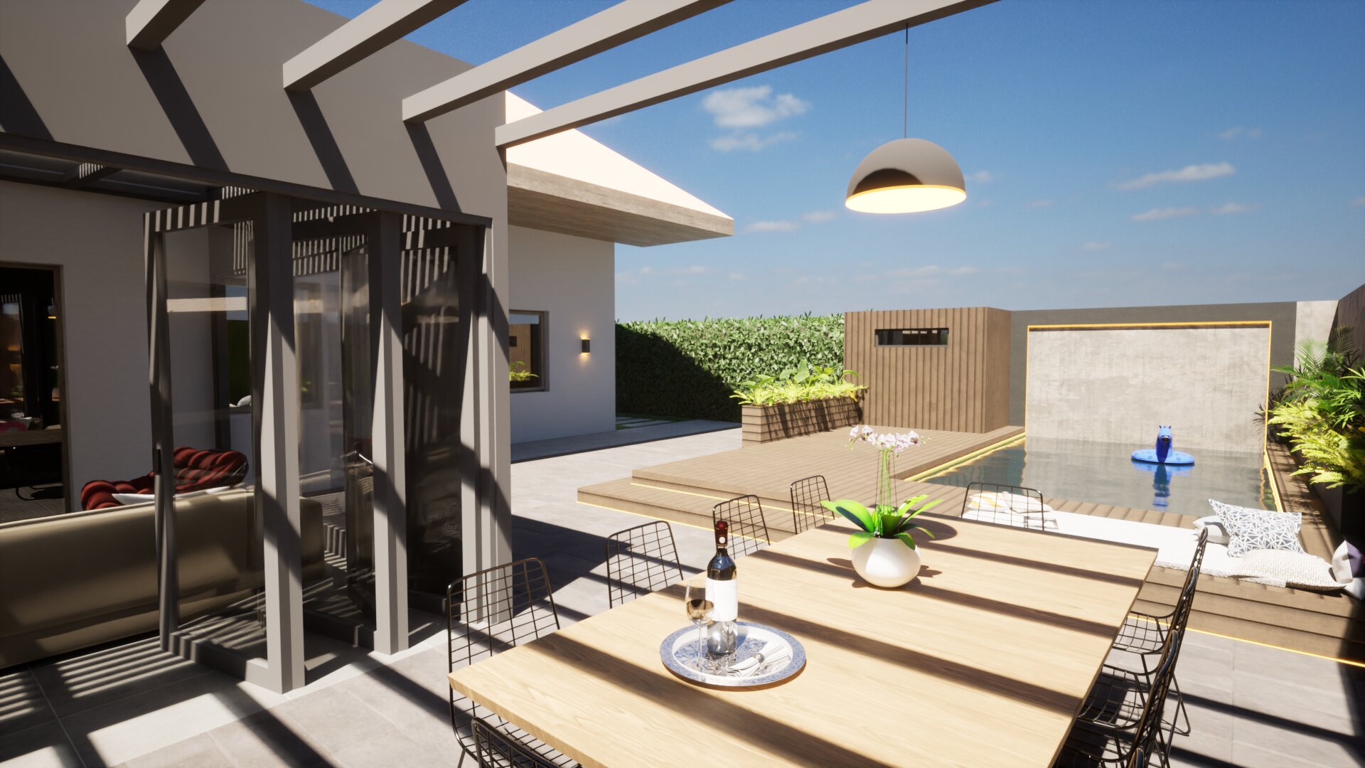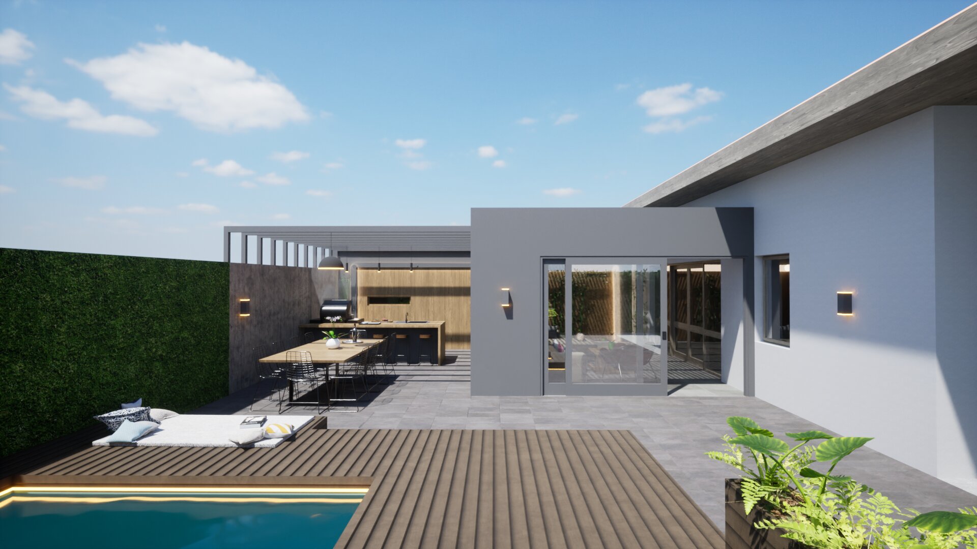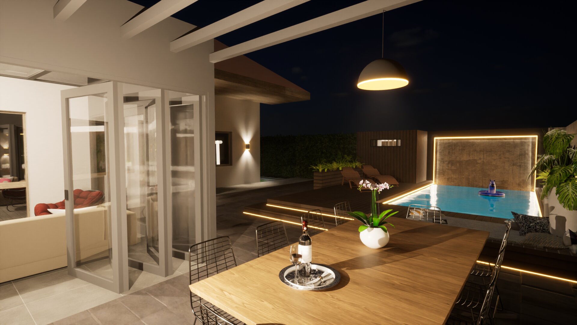 Fontos szempont volt olyan tereket kialakítani, amelyek helyet biztosíthatnak a család közösségi- illetve privát életviteléhez. Lehetőséget teremtettünk a kikapcsolódásra, amelyet a kerti grillező és medence mellett a konyhapult mögé rejtett szauna is tovább erősít, a télikerttel kapcsolódva a lakóépülethez.