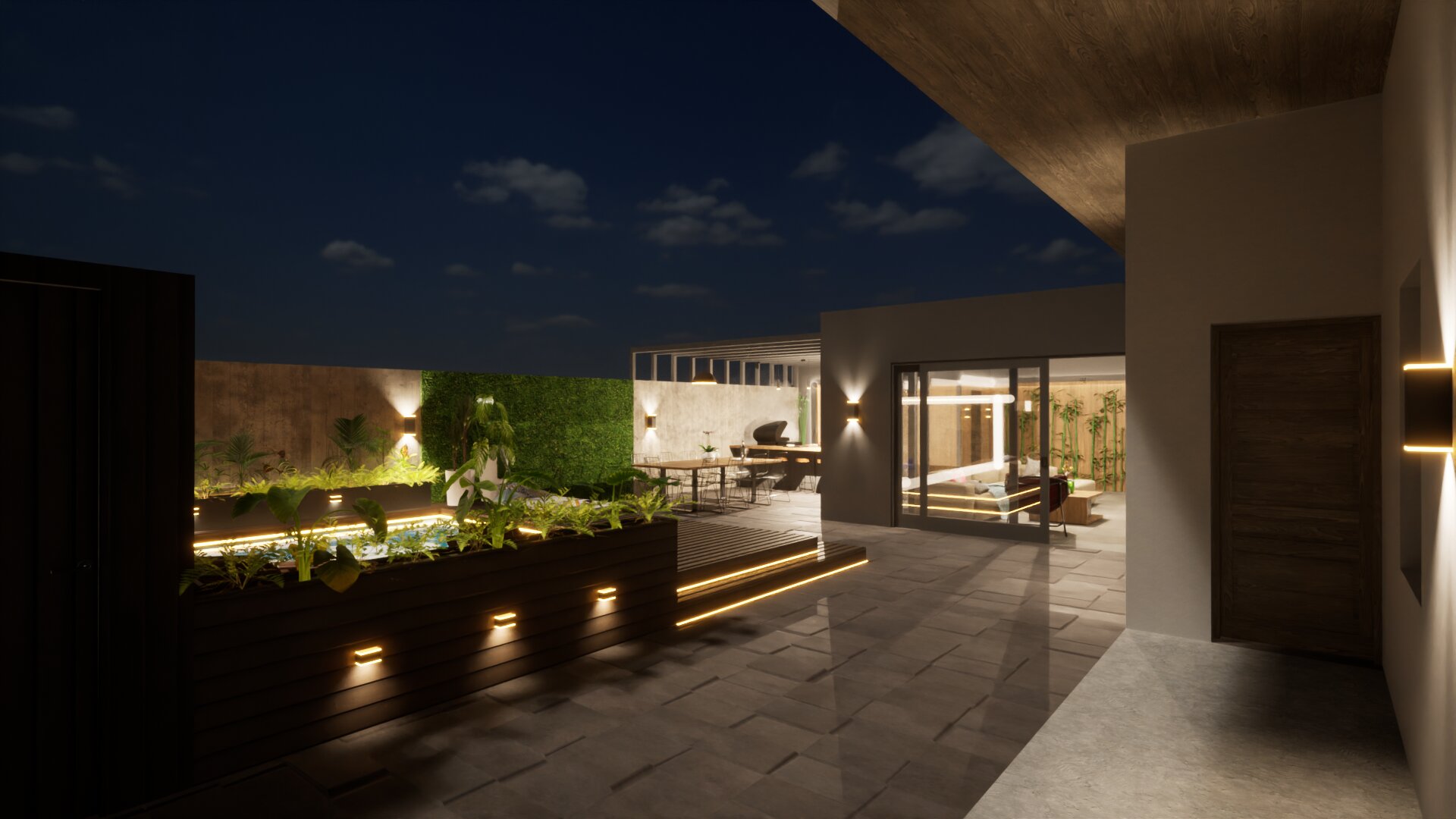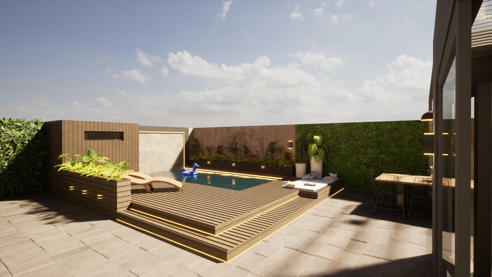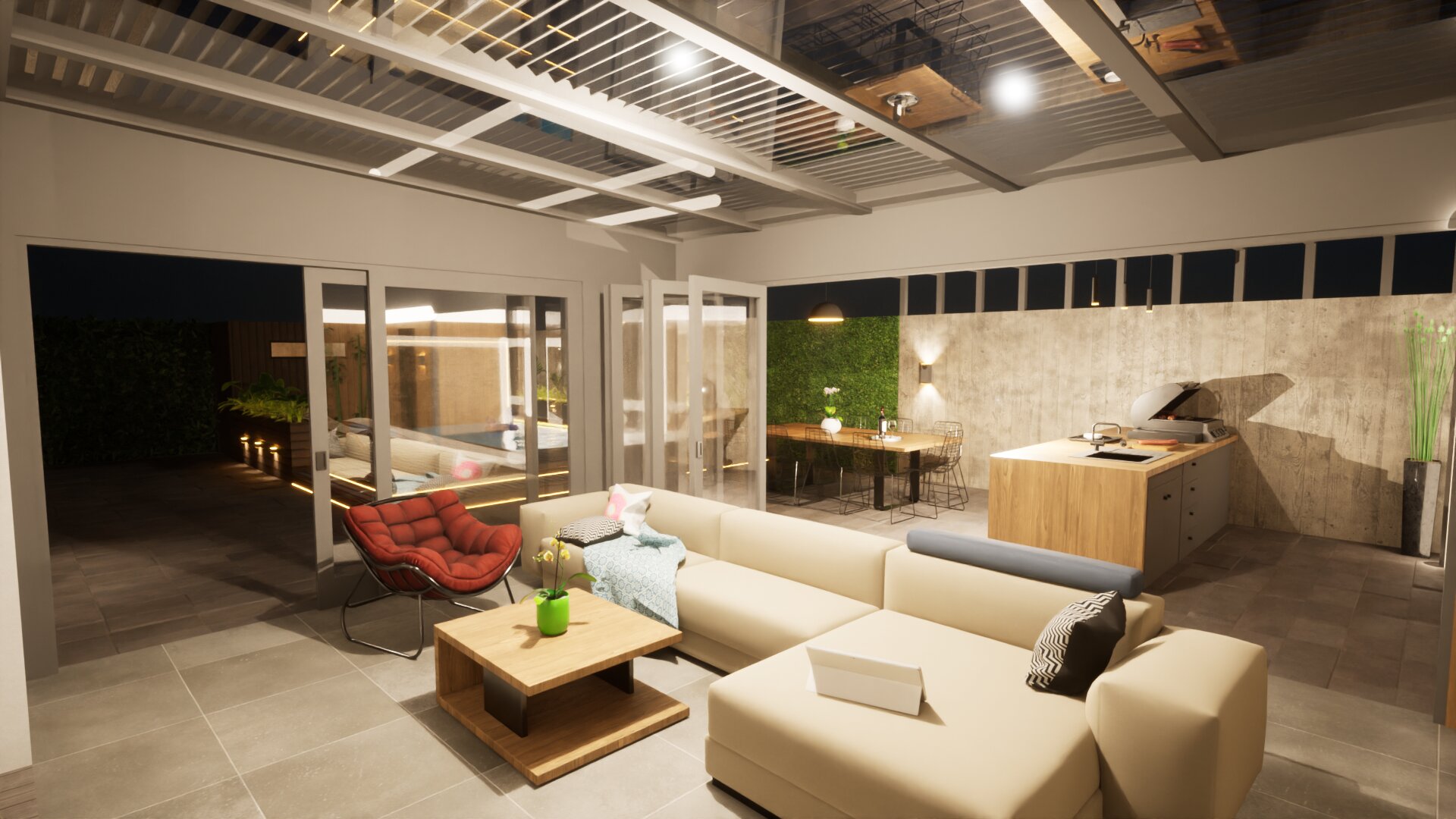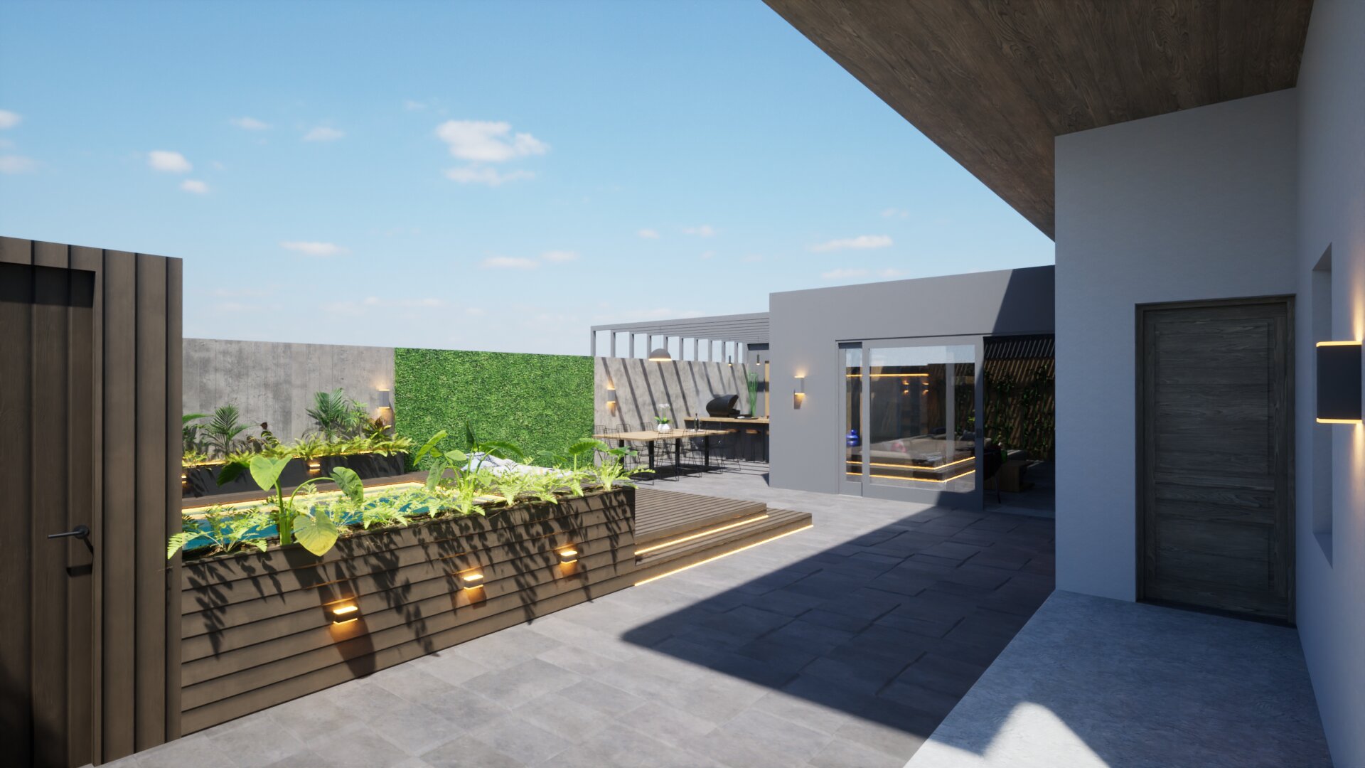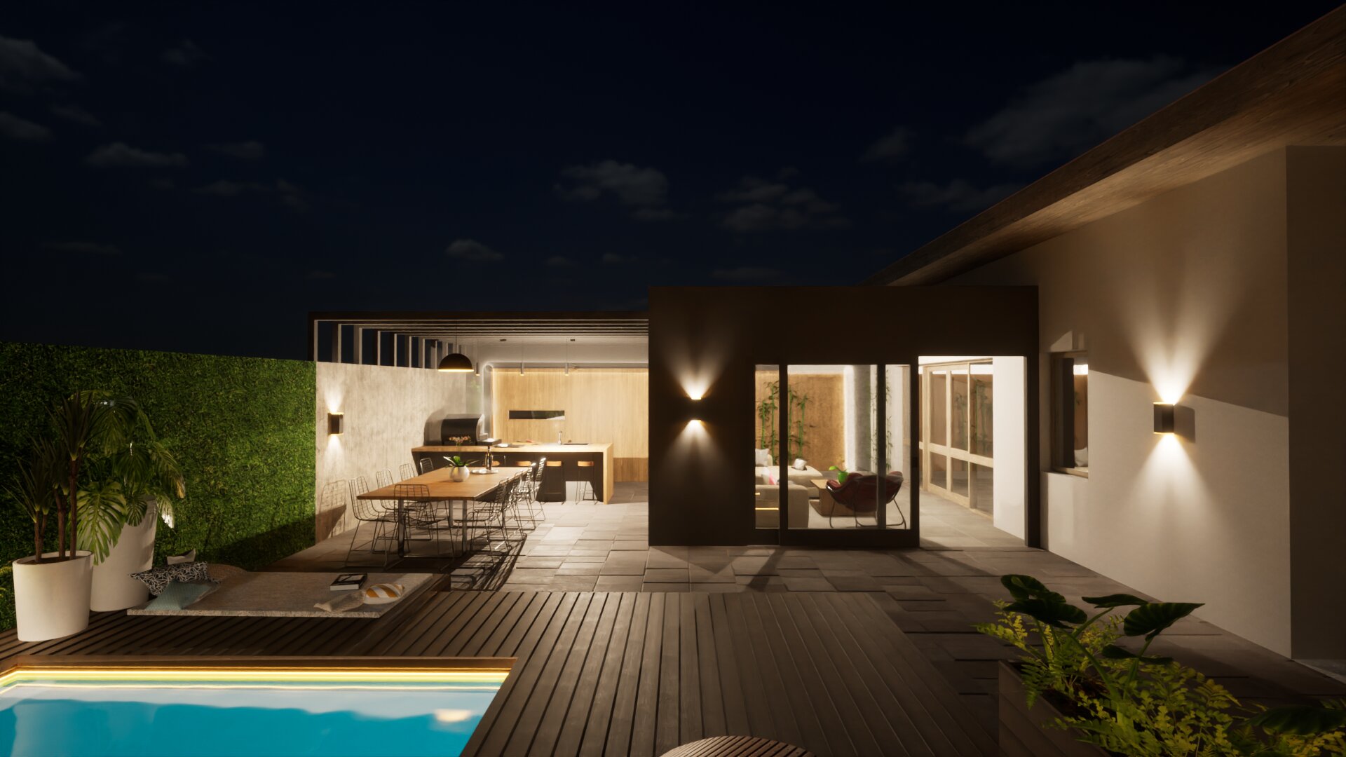 Fontos szempont volt olyan tereket kialakítani, amelyek helyet biztosíthatnak a család közösségi- illetve privát életviteléhez. Lehetőséget teremtettünk a kikapcsolódásra, amelyet a kerti grillező és medence mellett a konyhapult mögé rejtett szauna is tovább erősít, a télikerttel kapcsolódva a lakóépülethez.