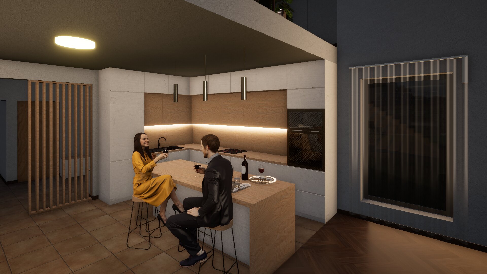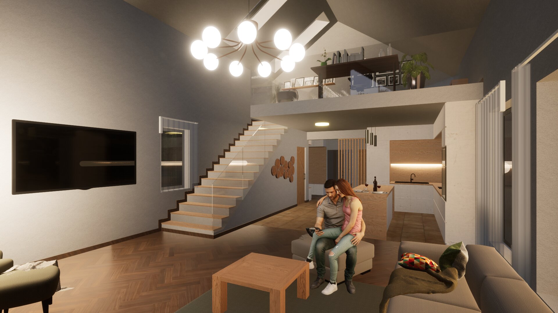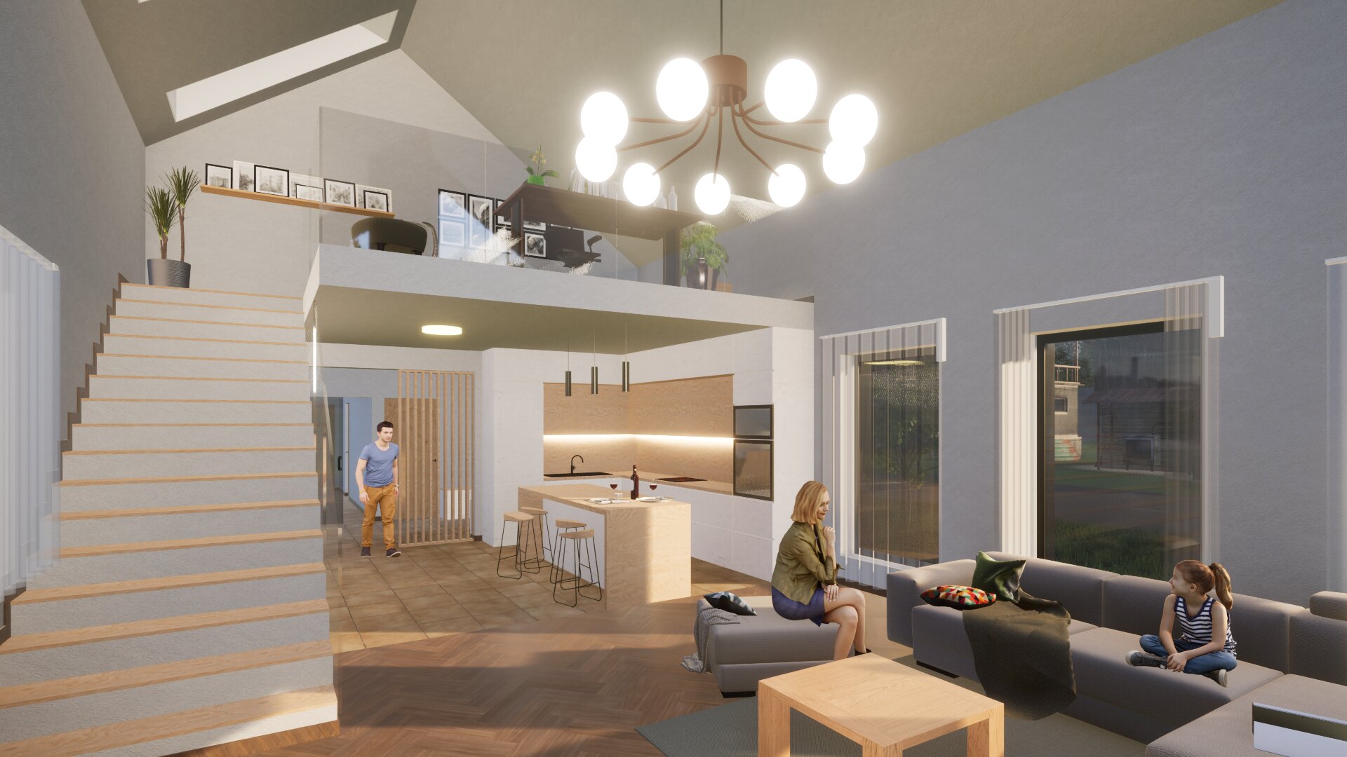 Két egységre tagoltuk a tömeget: privát és közösségi részekre. A bejárat jobb oldalára helyeztük el a hálószobákat és a hozzájuk tartozó kiszolgáló helyiségeket, míg a bal oldalán a nappali- étkező- konyha került elhelyezésre, az emeleten további galériával kiegészítve.