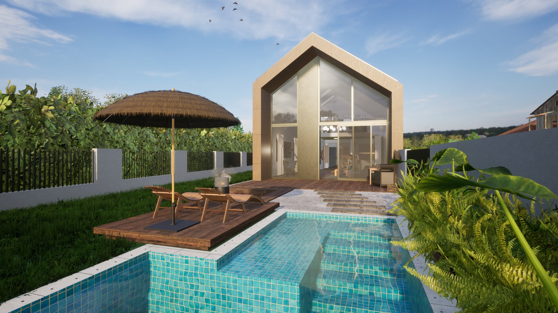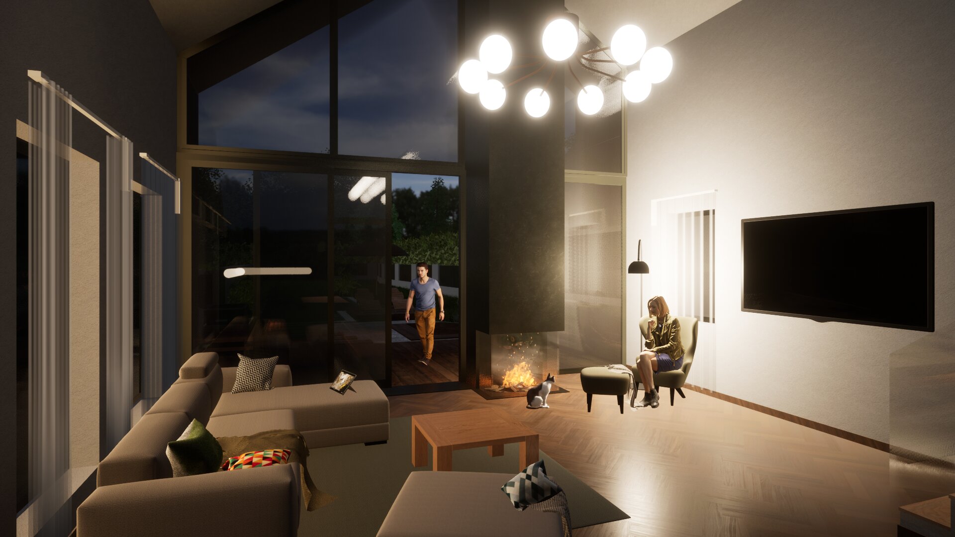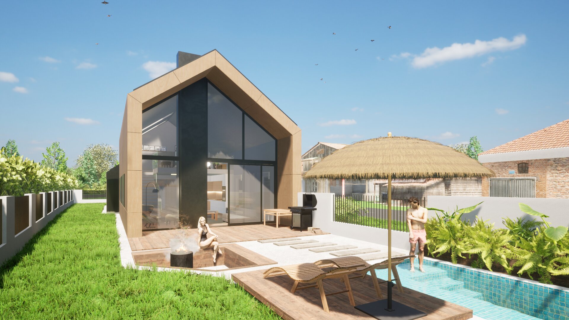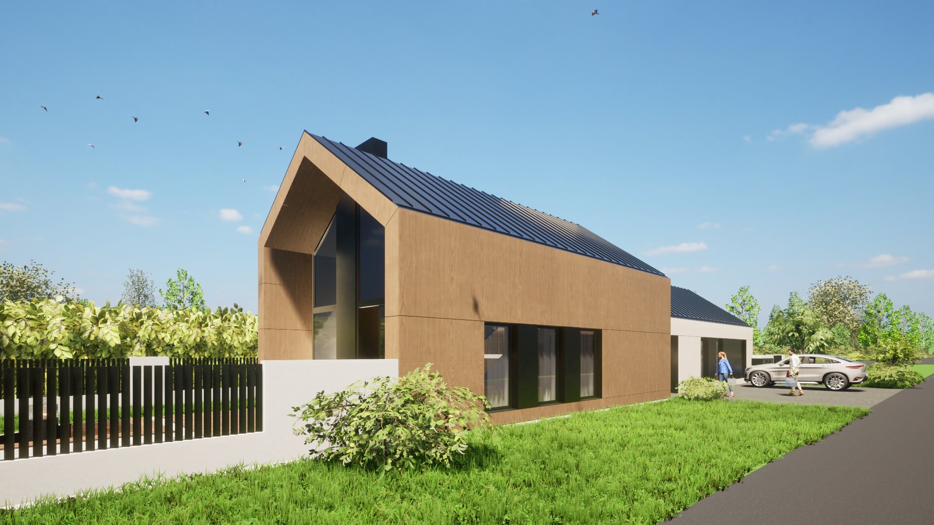 Két egységre tagoltuk a tömeget: privát és közösségi részekre. A bejárat jobb oldalára helyeztük el a hálószobákat és a hozzájuk tartozó kiszolgáló helyiségeket, míg a bal oldalán a nappali- étkező- konyha került elhelyezésre, az emeleten további galériával kiegészítve.
