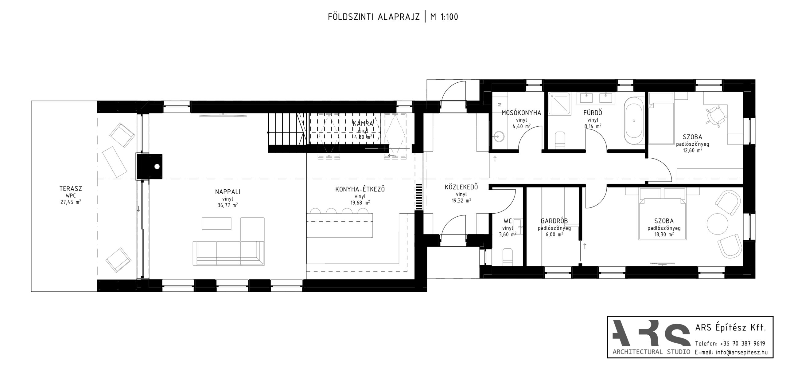 Projektünk legnagyobb kihívását a telek méretének adottságai jelentették. Hosszan hátranyúló, keskeny építési terület állt a rendelkezésünkre, amelyet közvetlenül a közterületre kellett megnyitnunk.
