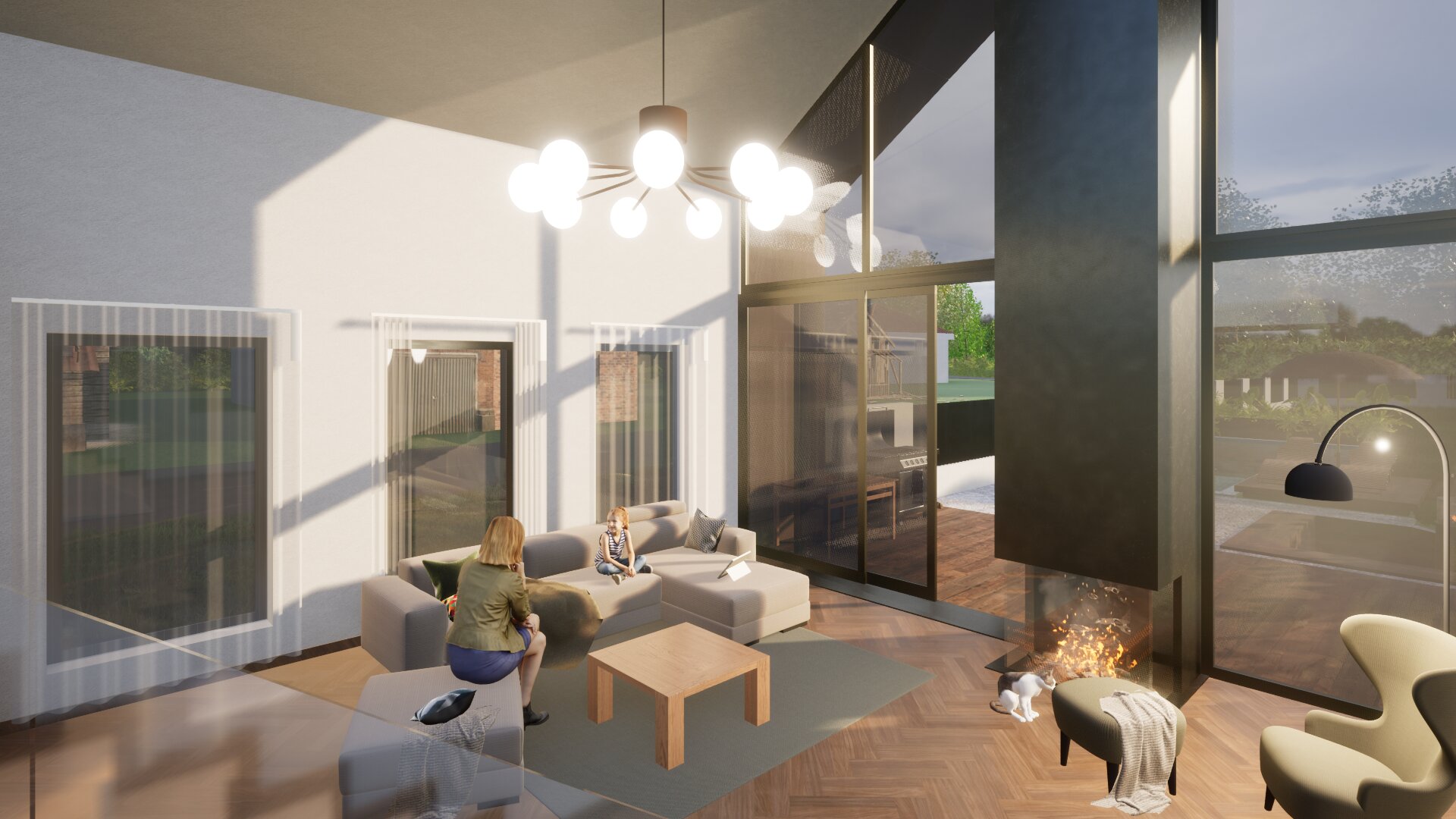Az épület egyik legerősebb eleme a nappali és a kert kapcsolata, amely lehetőséget teremt a közvetlen közelében található kastélykert rálátására is.