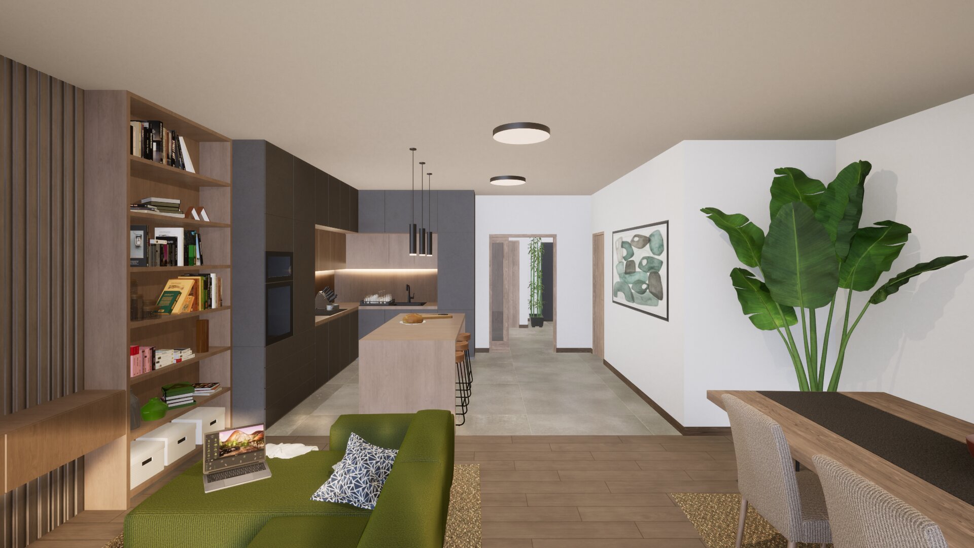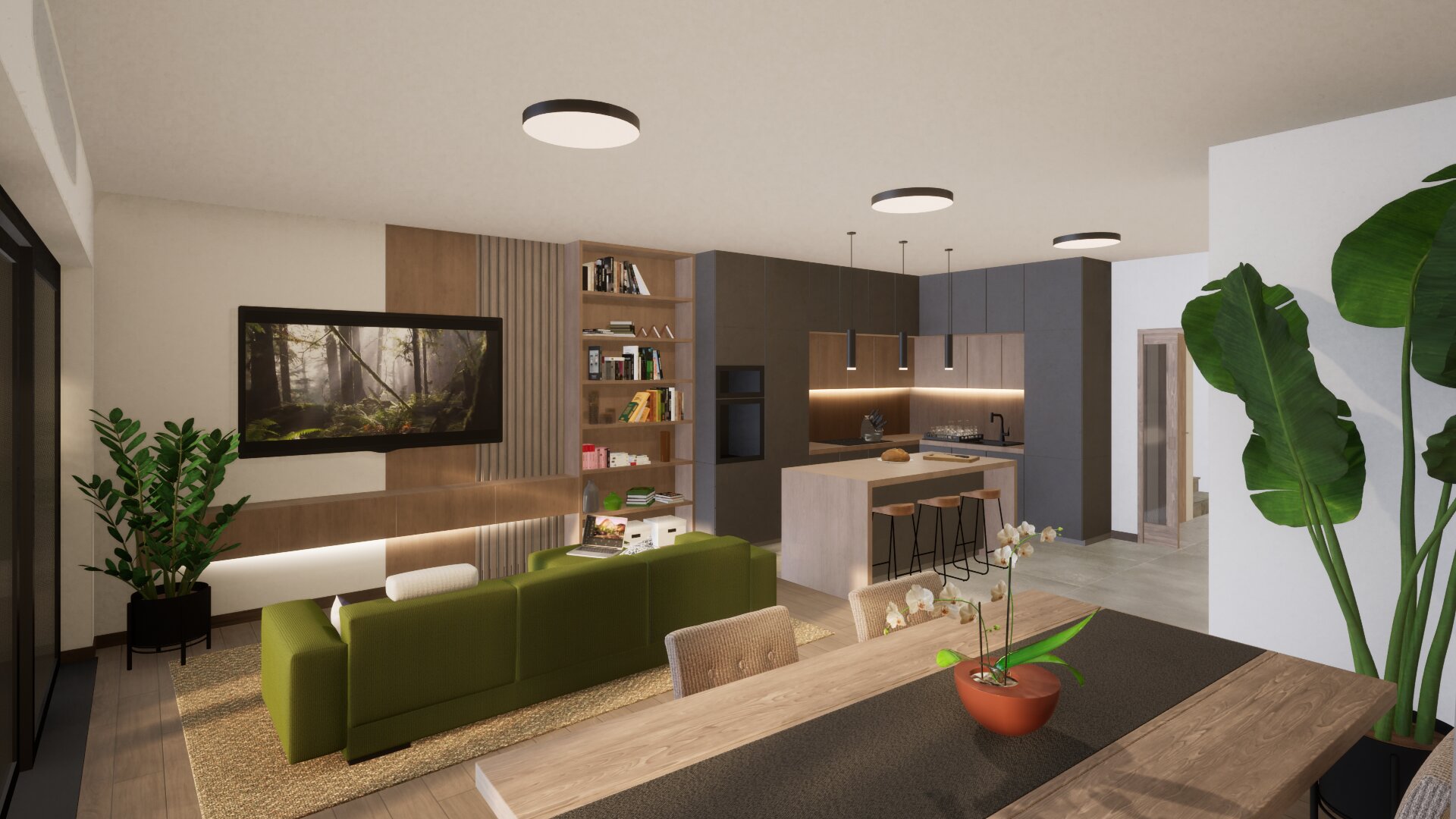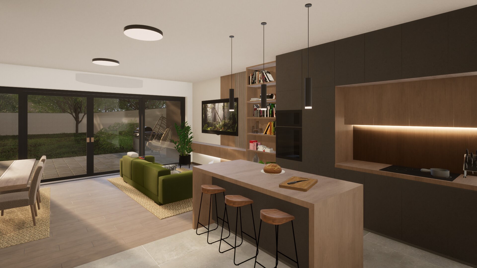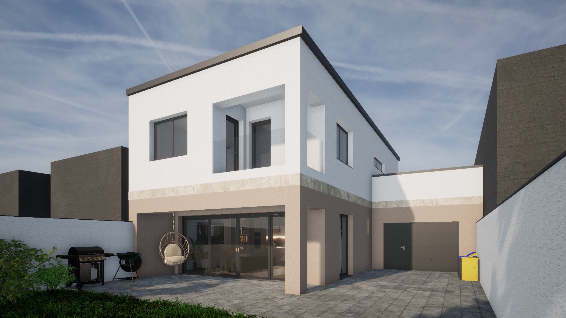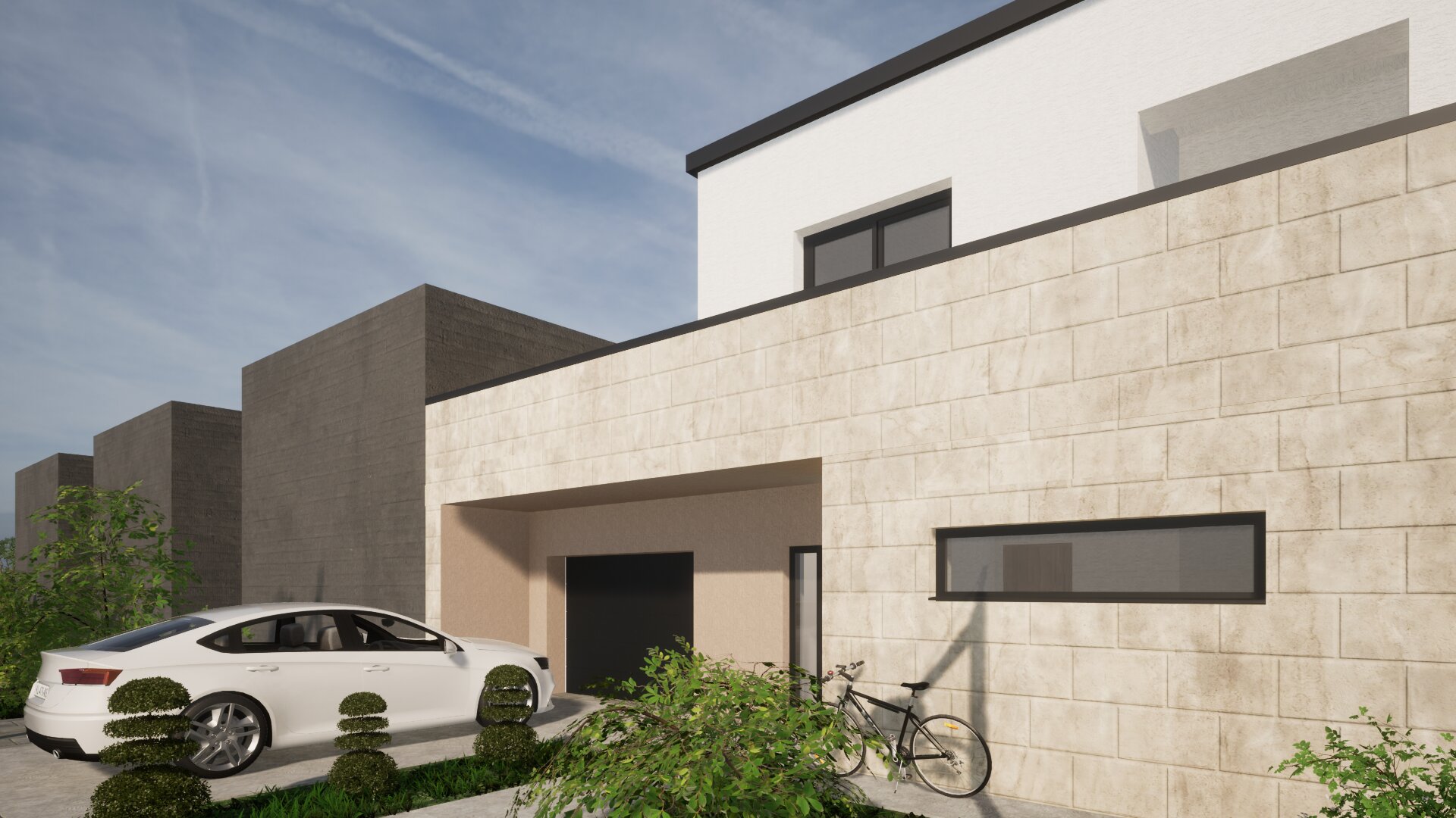 A homlokzat kialakításánál az volt a célunk, hogy az utcaképbe harmonikusan illeszkedő, mégis izgalmas és egyedi megjelenésű épületet hozzunk létre. Az épület belső tereiben központi szerepet kapott a nappali-étkező egység, amelyet a hátsó kerttel szoros kapcsolatban alakítottunk ki.