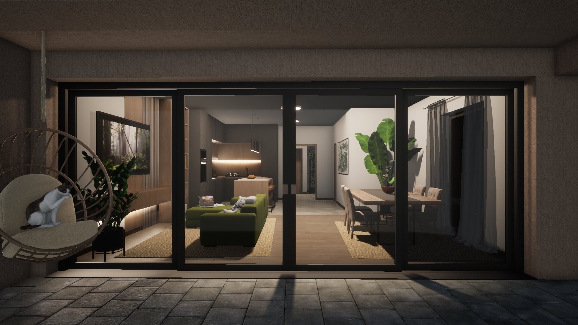 A nagy üvegfelületek, tolóajtók és a kertre néző teraszok lehetővé teszik, hogy a beltér szinte szerves részévé váljon a kertnek, így egy világos, barátságos és otthonos életteret hoztunk létre.